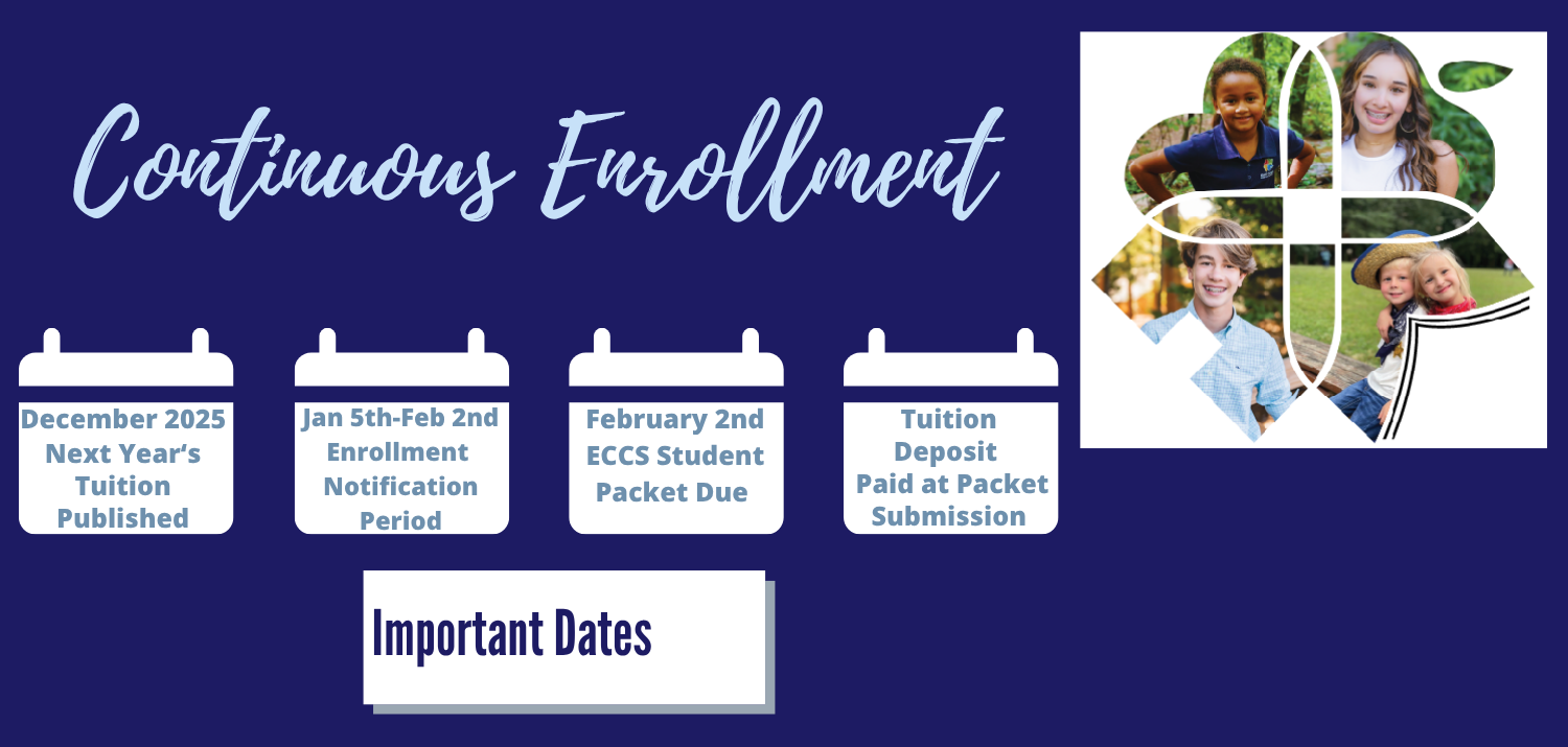 All families are required to provide a tuition deposit (to be determined) per student enrolled that is paid upon submission of each ECCS Student Packet. This deposit goes toward your annual tuition. It is not refunded if a student is withdrawn after February 2, 2026 for the following year.